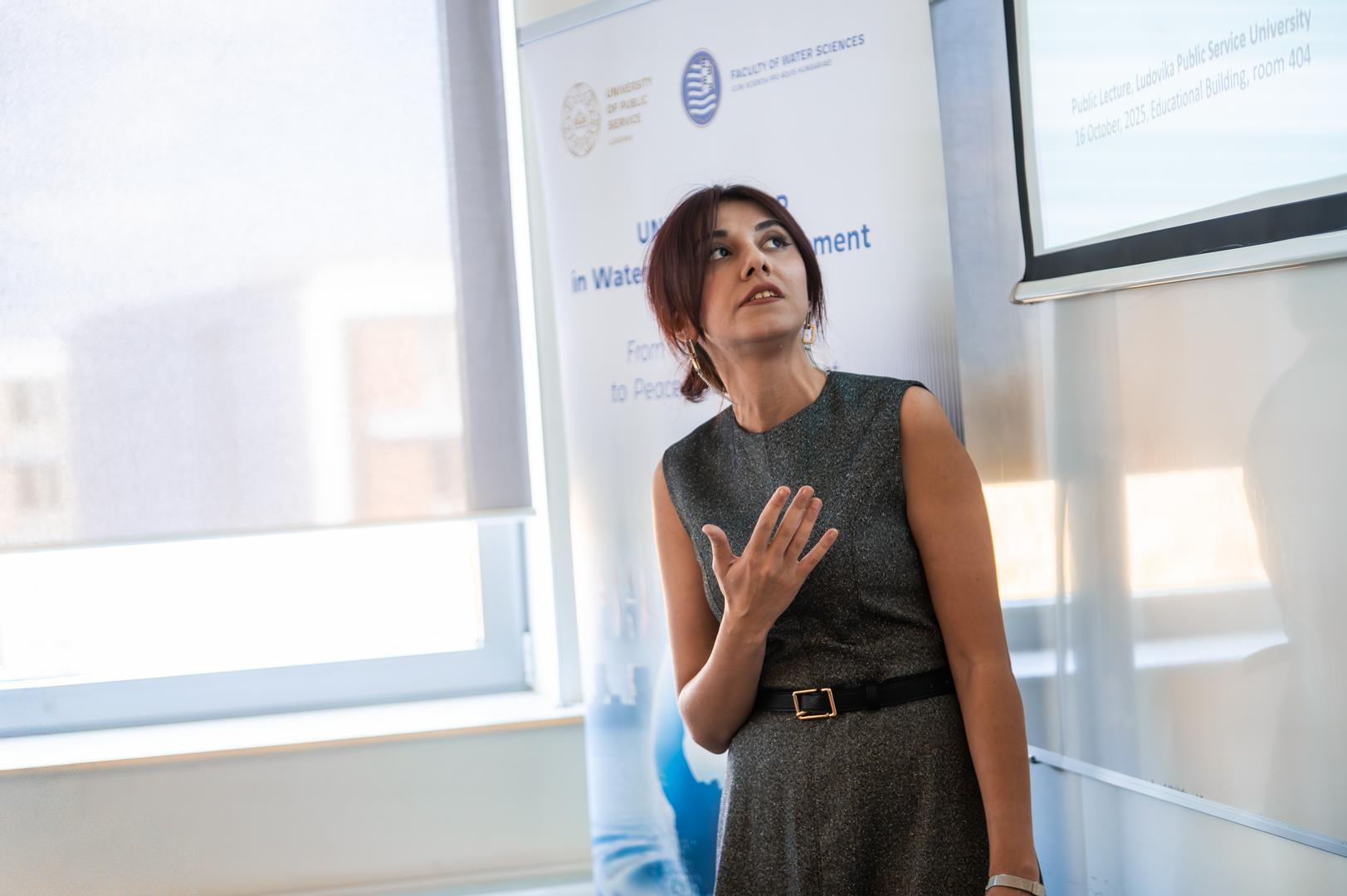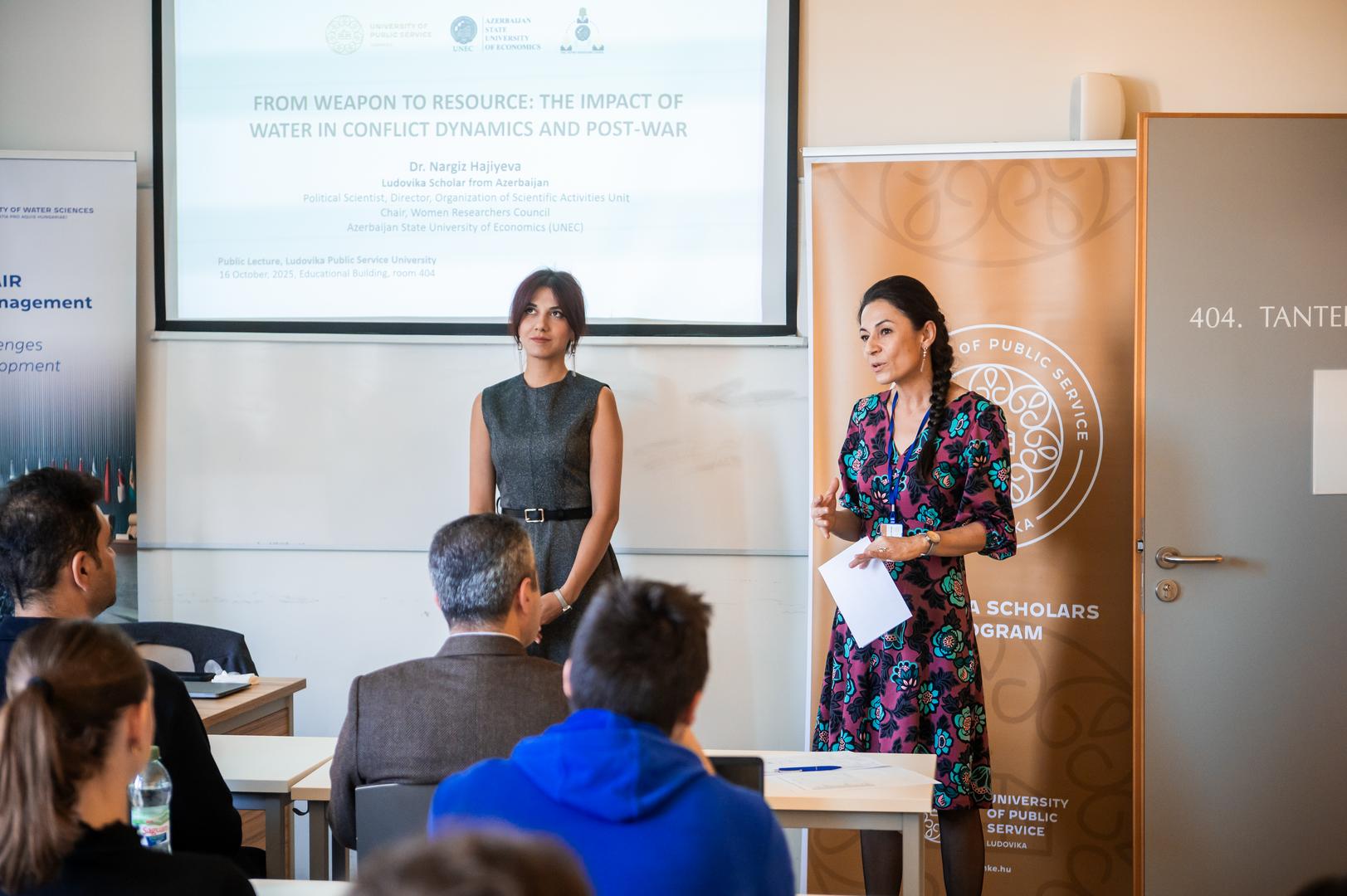 As part of the Ludovika Scholars Program, on 16 October, Dr. Hajiyeva delivered her second public lecture, titled “From Weapon to Resource: The Impact of Water in Conflict Dynamics and Post-War,” also held at the Ludovika Campus Educational Building. This event likewise drew exceptional attention, with more than one hundred participants following the lecture on-site and online. The lecture focused on how the green transition and sustainable development are not only environmental issues, but also economic and social challenges. Using the examples of Azerbaijan and Hungary, Dr. Hajiyeva demonstrated how national economic growth impacts the ecological environment and how genuine progress can be achieved through the promotion of green entrepreneurship, empowering women entrepreneurs, and educating younger generations in environmental awareness. She devoted special attention to green innovation, renewable energy production, and smart urban development, presenting recent Azerbaijani initiatives such as the Ganja Green City Action Plan and the Karabakh Green Energy Zone. Dr. Hajiyeva emphasized that professionals working in the field of water and environmental policy need an interdisciplinary approach: beyond technical knowledge, economic, social, and communication skills are also vital for building a sustainable future.